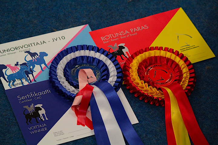 ERI, JUK1, PU1, SERT, ROP, JV-10, V-10Sitten ensin jaettiin paras uros, serti, juniorivoittaja käteen ja hetki huudeltiin narttuja kehään ja todettiin että on se sitten rodun paraskin ja voittaja, mutta junnuluokassa esitettynä cacibia ei saa. Tuuli Niemisen albumissa pari kuvaa lisää. Kiitokset sille suunnalle kuvista.